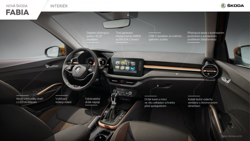 Nové farby prinášajú do interiéru modelu FABIA kontrastné švíky a dekoračné lišty medenej a šedej farby. Nové ambientné osvetlenie z LED, ktoré je štandardným prvkom verzie vybavenia Style, osvetľuje dekoračnú lištu na prístrojovej doske červenou a bielou farbou. Súčasťou ambientného osvetlenia je aj LED osvetlenie stredovej konzoly vpredu, vnútorných kľučiek predných dverí a LED lampičky na čítanie vpredu a vzadu. Dizajn interiéru dotvárajú nové volanty. Kožený multifunkčný volant a trojramenný športový multifunkčný volant s pádlami pre vozidlá vybavené prevodovkou DSG sú prvkami vybavenia na želanie, rovnako ako vyhrievaný volant a vyhrievané čelné sklo, ktoré zaručuje dobrý výhľad a vysokú úroveň bezpečnosti v zimných mesiacoch. Obidva tieto prvky sú v modelovom rade FABIA k dispozícii po prvý raz – tieto komfortné prvky boli doteraz vyhradené najmä automobilom vyšších tried.