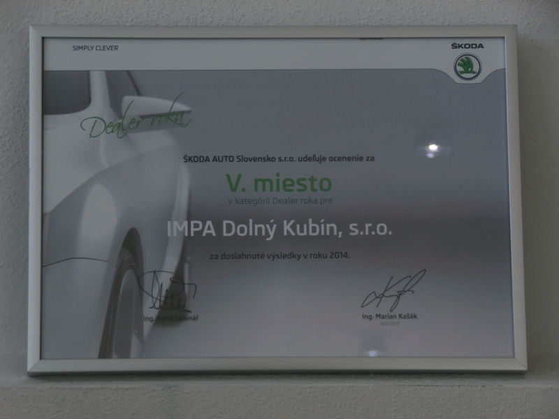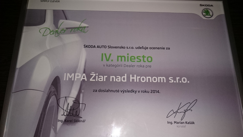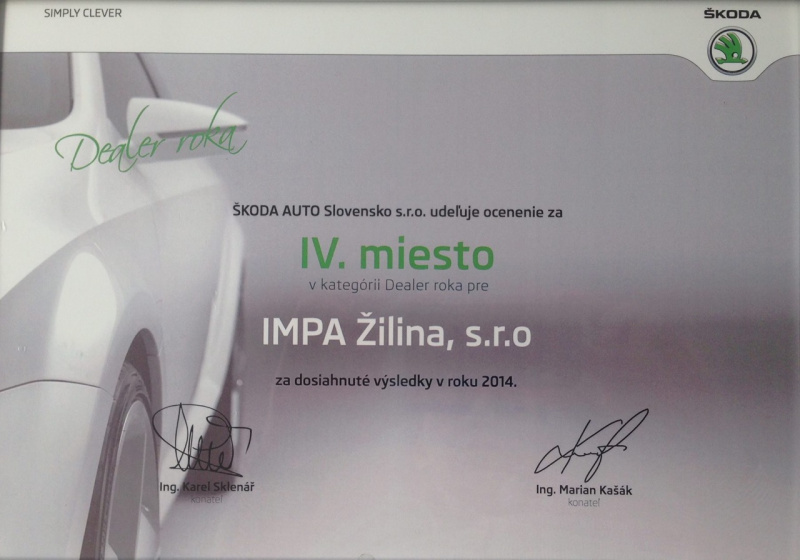 Za rok 2014 sme sa na základe hodnotenia predaja vozidiel a ŠKODA Originálneho príslušenstva, kvality služieb a kvality servisu získali v kategórii Dealer roka:
